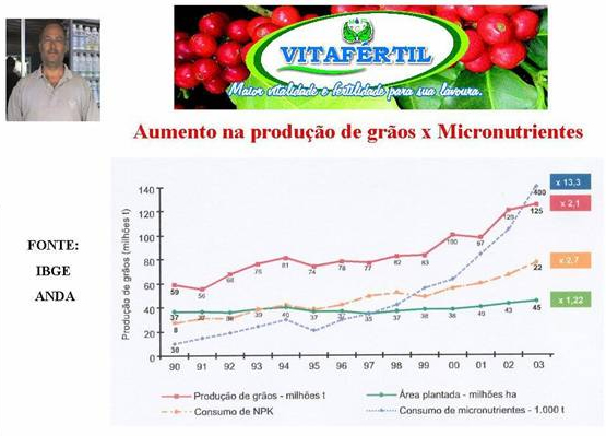 Segundo Eng. Agro. MAURICIO DE C R FILHO responsável técnico pelo desenvolvimento do produto VITAFERTIL relata que a pulverização via foliar tem aumentado muito durante os últimos 10 anos, beneficiando o setor cafeeiro e aumentando consideravelmente a media de sacas / Há ano a ano.